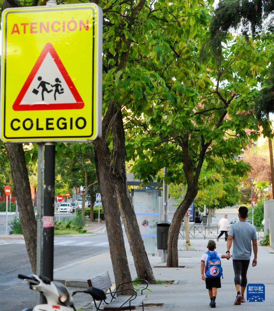 9月8日,一名家長在西班牙馬德里送孩子上學。