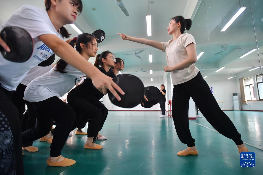 在長沙職業技術學院特殊教育學院的舞蹈房里,鄧蕓虹(右一)帶著學生排練舞蹈《信仰的力量》(9月7日攝)。