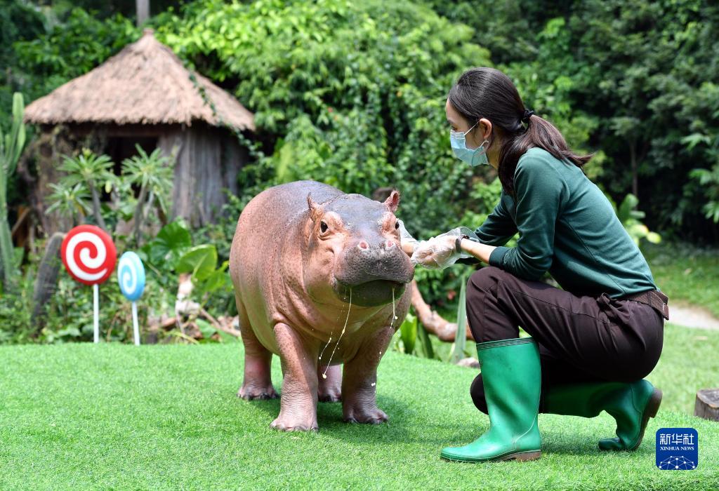 當日,非洲河馬菲菲在廣州長隆野生動物世界迎來兩周歲生日。菲菲是長隆人工育幼長大的雌性河馬寶寶,目前體重超過200公斤。