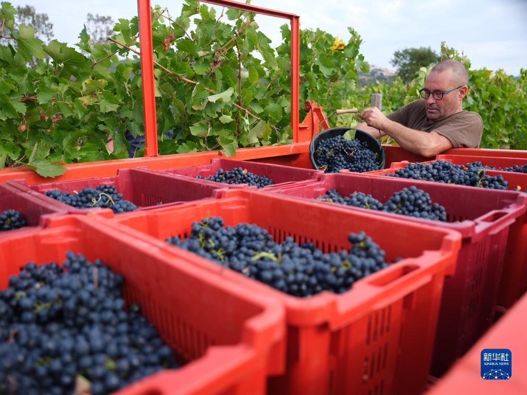 9月9日,在法國南部濱海阿爾卑斯省的芒德略拉納普勒,果農采摘用來釀酒的葡萄。