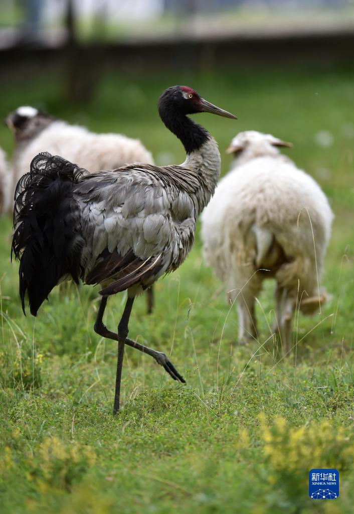 在西藏日喀則市扎什倫布寺院內,一只黑頸鶴與一群放生羊生活在一起,和睦相處。這只黑頸鶴曾因受傷無法遷徙,被附近的村民送到寺廟院里。如今,黑頸鶴儼然成了羊群的“頭羊”,被當地人稱為“牧羊的鶴”。