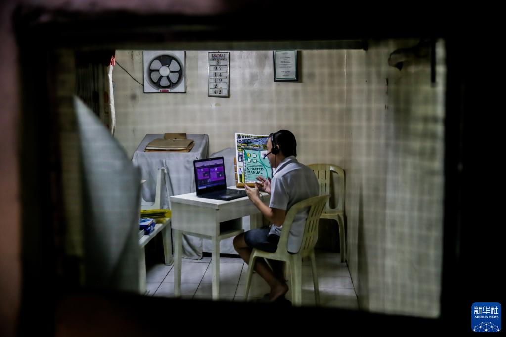 9月13日,在菲律賓馬尼拉,教師卡爾文·埃羅爾·阿爾坎塔拉在2021-2022學年開學第一天通過網絡為學生上課。當日,菲律賓教育部門通過網絡、電視和電臺等形式開啟了新學年的教學。