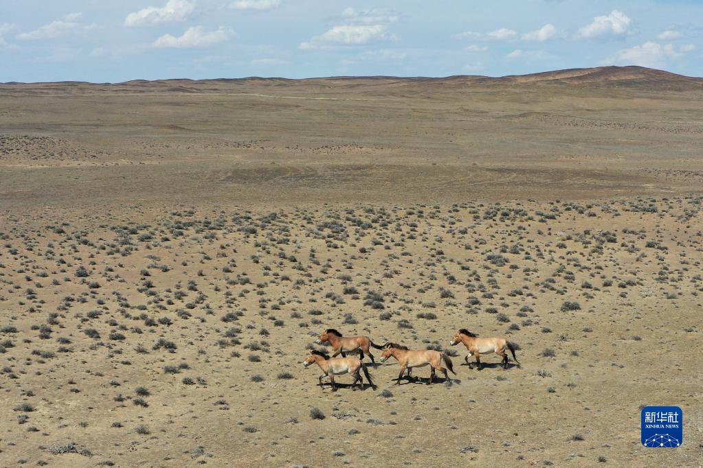 野馬在新疆卡拉麥里山有蹄類野生動物自然保護區漫步(2020年6月3日攝,無人機照片)。
