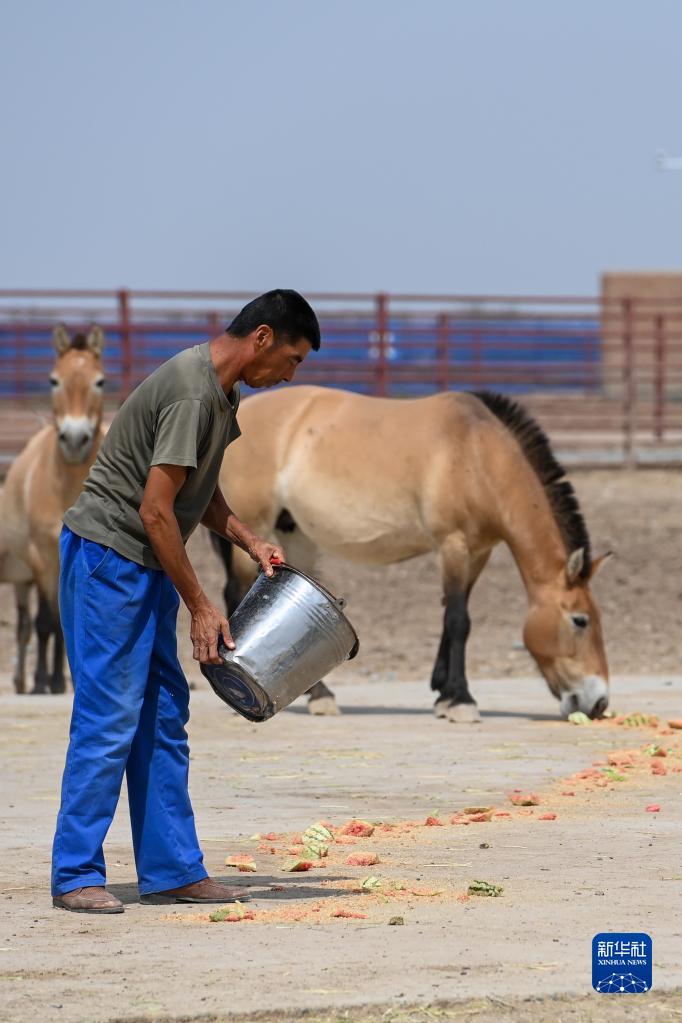 在新疆野馬繁殖研究中心,飼養員投喂西瓜,為野馬防暑降溫(8月10日攝)。