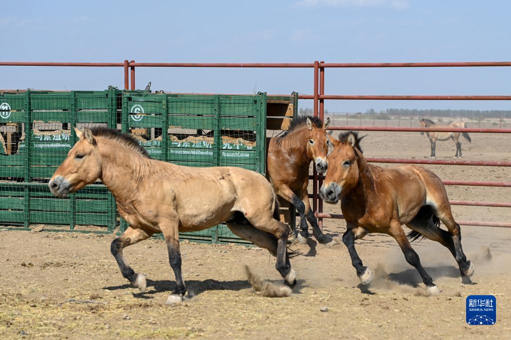 在新疆野馬繁殖研究中心,即將放歸野外的野馬進行適應運馬箱訓練(8月9日攝)。