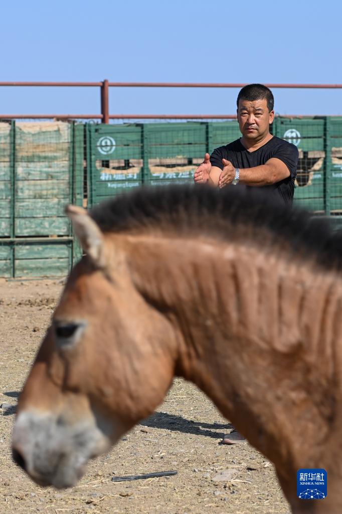 在新疆野馬繁殖研究中心,王振彪對即將放歸野外的野馬進行適應運馬箱訓練(8月9日攝)。