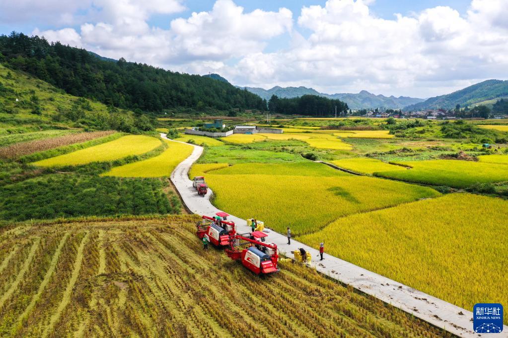 連日來,貴州省黔南布依族苗族自治州龍里縣灣灘河鎮天氣晴好。水稻成熟,田野鍍金,農民搶收稻谷,一片豐收景象。