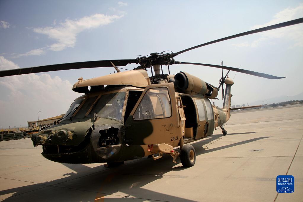 這是9月20日在阿富汗喀布爾機場拍攝的被毀壞的阿富汗空軍直升機。