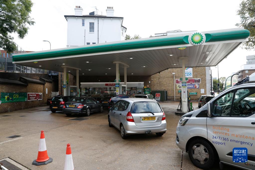 9月27日,車輛排隊駛入英國倫敦一家加油站加油。新華社記者 韓巖 攝
