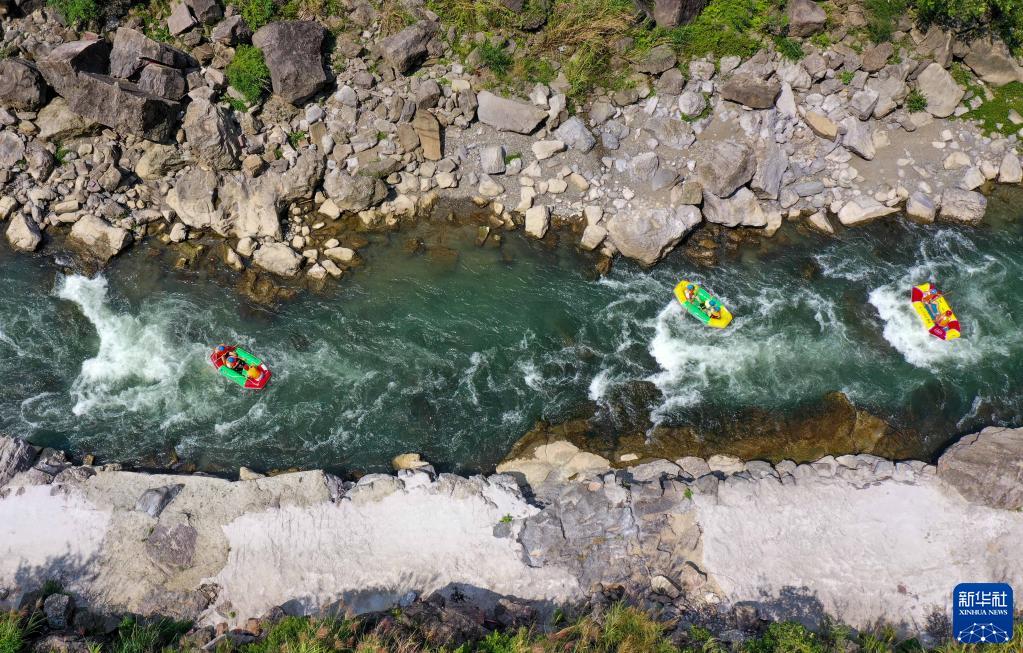 10月2日,游客在貴陽市開陽縣南江大峽谷景區體驗漂流(無人機照片)。