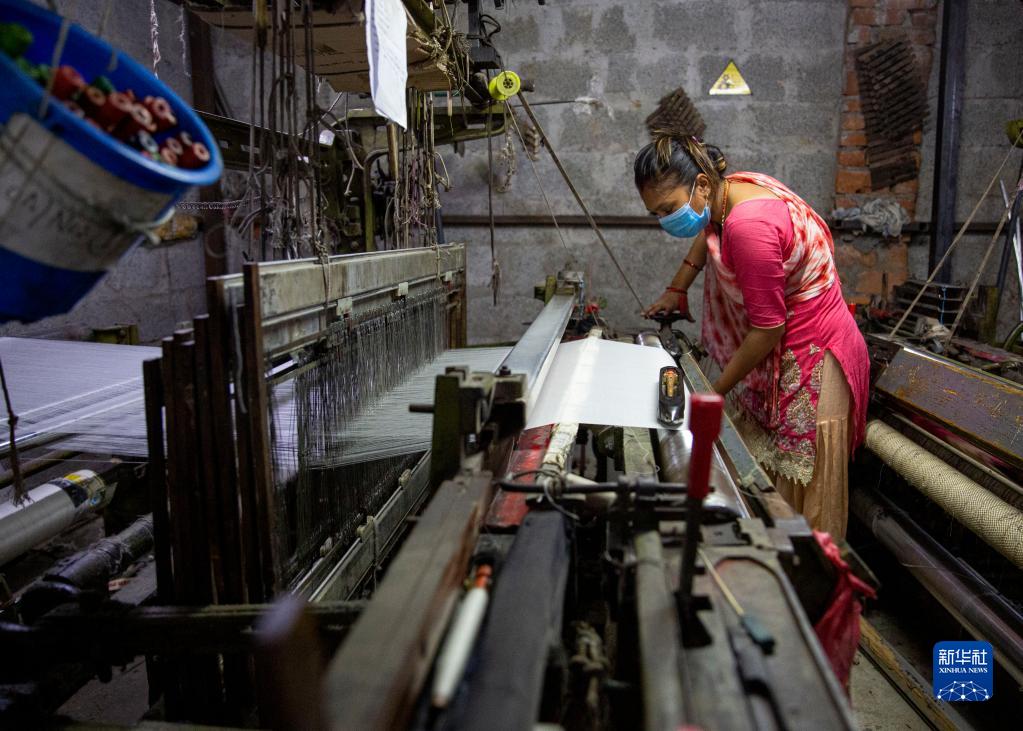 10月10日,一名工人在尼泊爾加德滿都的一處披肩工廠工作。