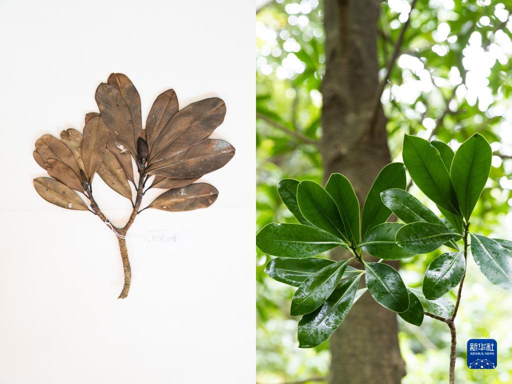 這是10月10日在昆明植物園拍攝的華蓋木。這張拼版照片分別為科研人員野外采集的標本(左)和在植物園遷地保護后存活下來的同種植物。