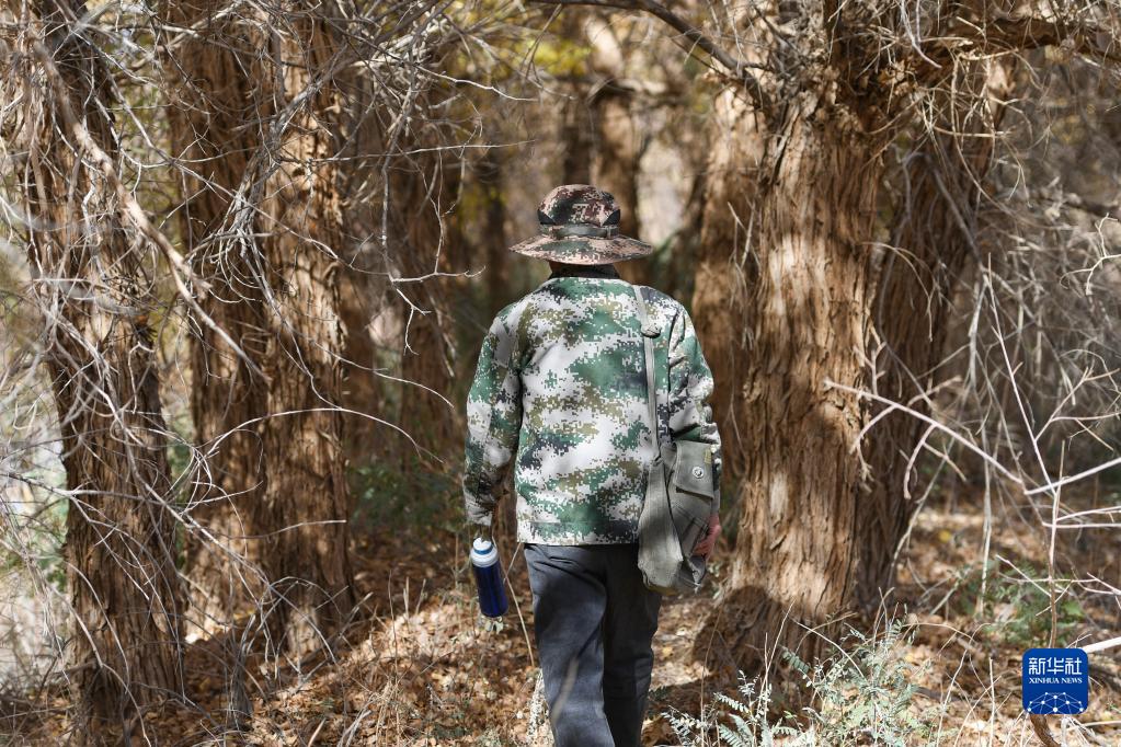 10月11日,護林員魏存廣在額濟納旗七道橋胡楊林區巡護。新華社記者 劉磊 攝
