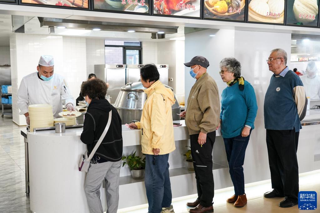 10月12日,在位于河北燕郊的燕達金色年華健康養護中心餐廳內,呂偉業(右一)和老伴兒李戰平(左)與其他老人在排隊取餐。