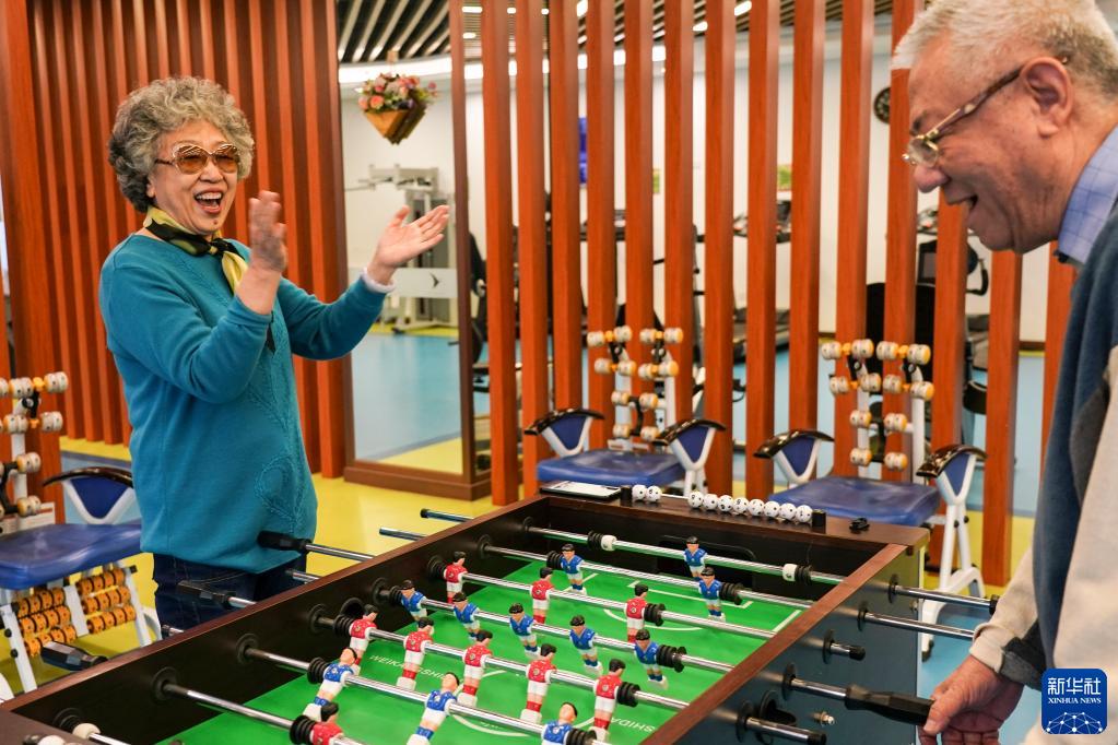 10月12日,在位于河北燕郊的燕達金色年華健康養護中心活動中心內,呂偉業和老伴兒李戰平(左)在玩桌面足球。