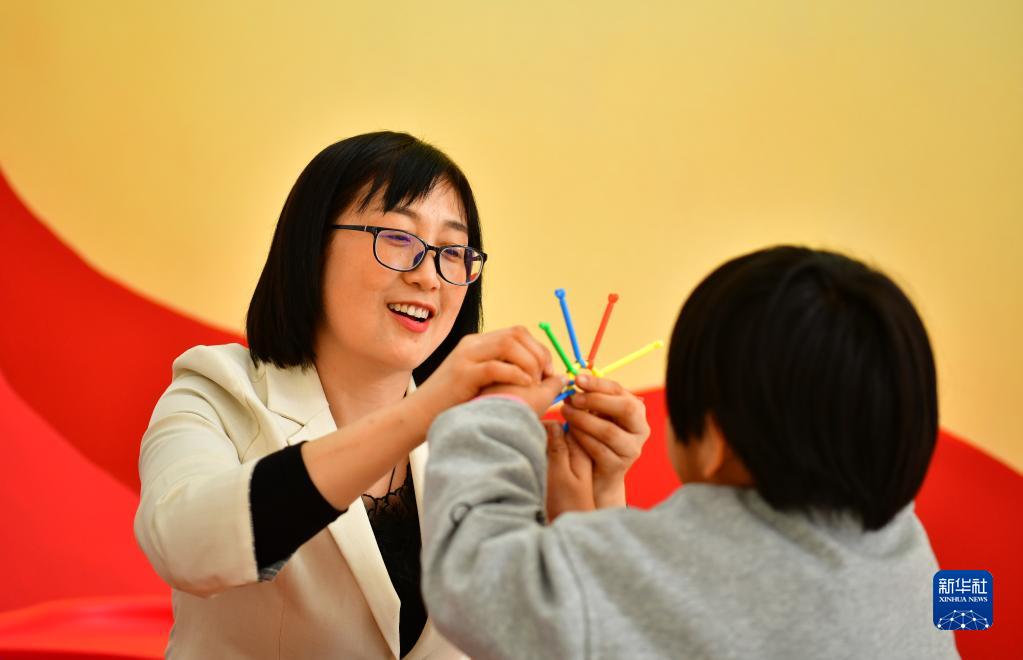 10月13日,張余敏(左)在海興縣特教學校精細動作康復室內和學生做游戲。