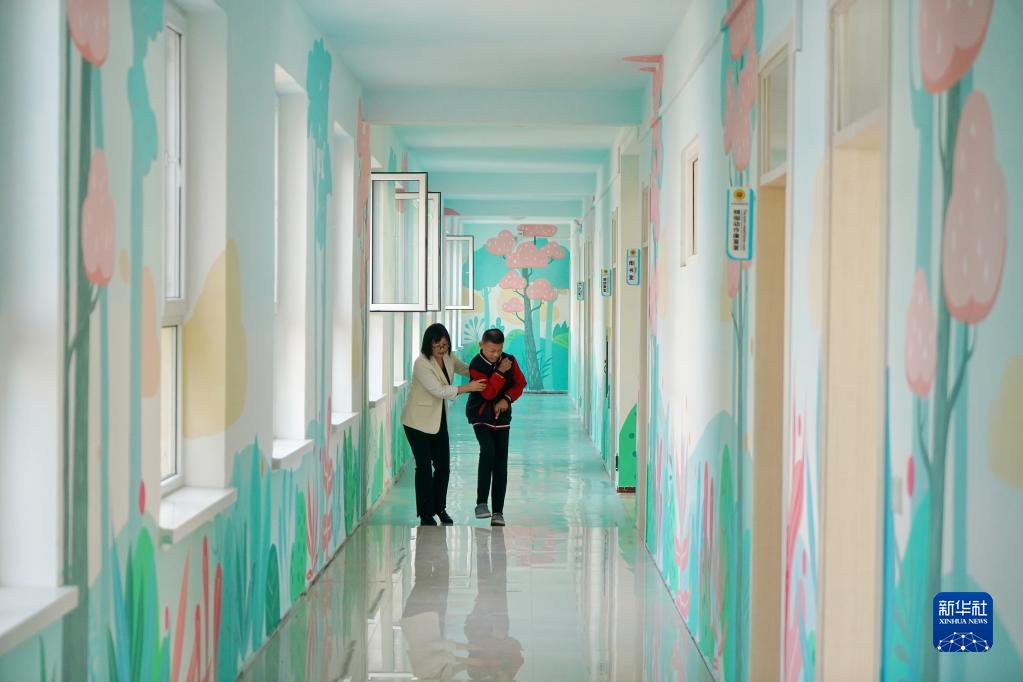 10月13日,張余敏(左)在海興縣特教學校內攙扶一名學生行走。