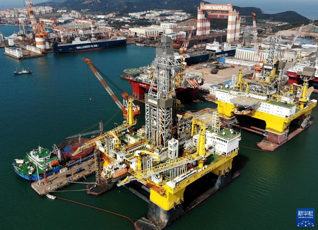 “藍鯨1號”(前右)及姊妹平臺“藍鯨2號”(前左)正在其生產基地中集來福士海洋工程有限公司煙臺基地進行維護和保養(10月18日攝,無人機照片)。