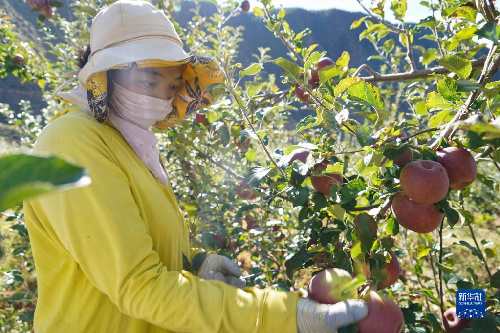 10月20日,在四川甘孜鄉城縣青德鎮萬畝果園內,村民在采摘蘋果。