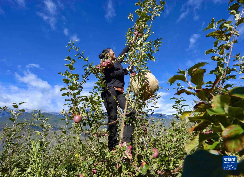 10月20日,在四川甘孜鄉城縣青德鎮萬畝果園,村民在采摘蘋果。