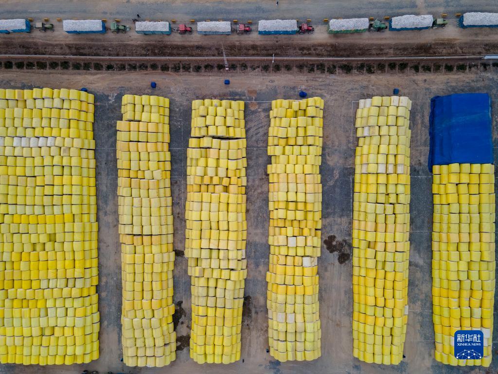 新疆沙灣市的棉農在一家棉花收購廠外排隊等候銷售(10月20日攝,無人機照片)。新華社記者 胡虎虎 攝