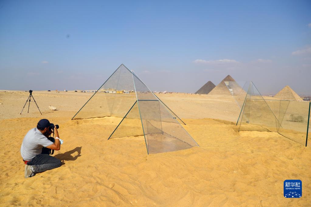 10月21日,游客在埃及吉薩金字塔景區舉辦的藝術展上拍攝一件藝術作品。