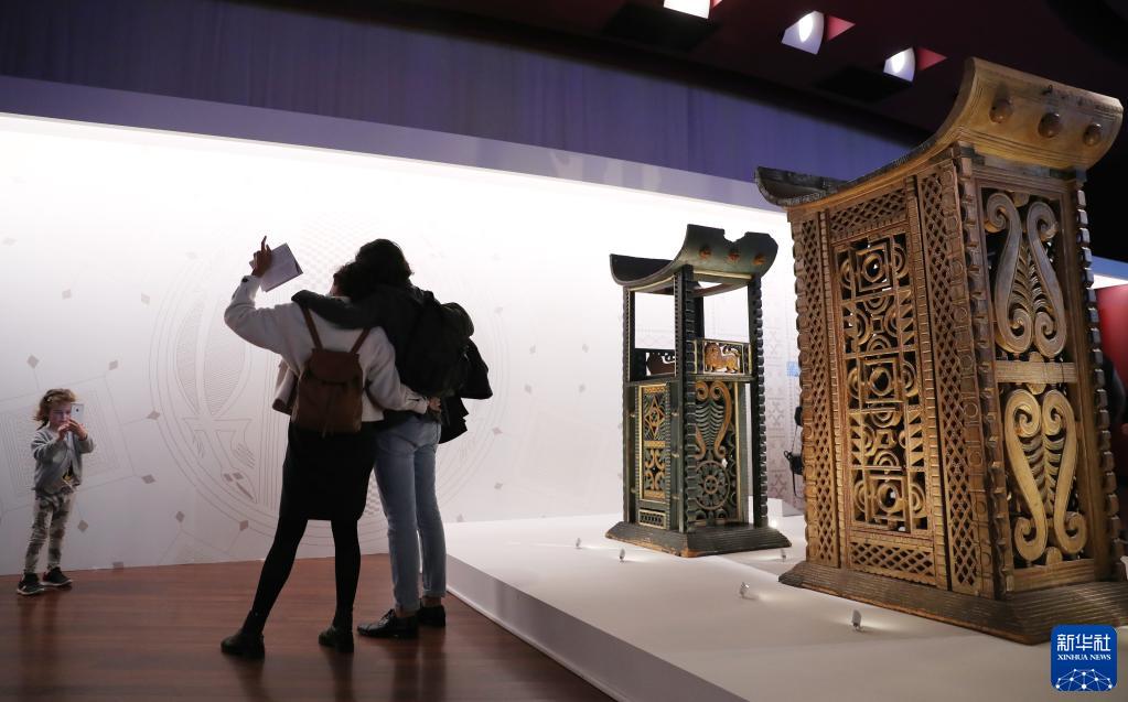 10月28日,在法國巴黎凱布朗利博物館舉行的貝寧文物展上,一個小女孩為父母拍照留念。