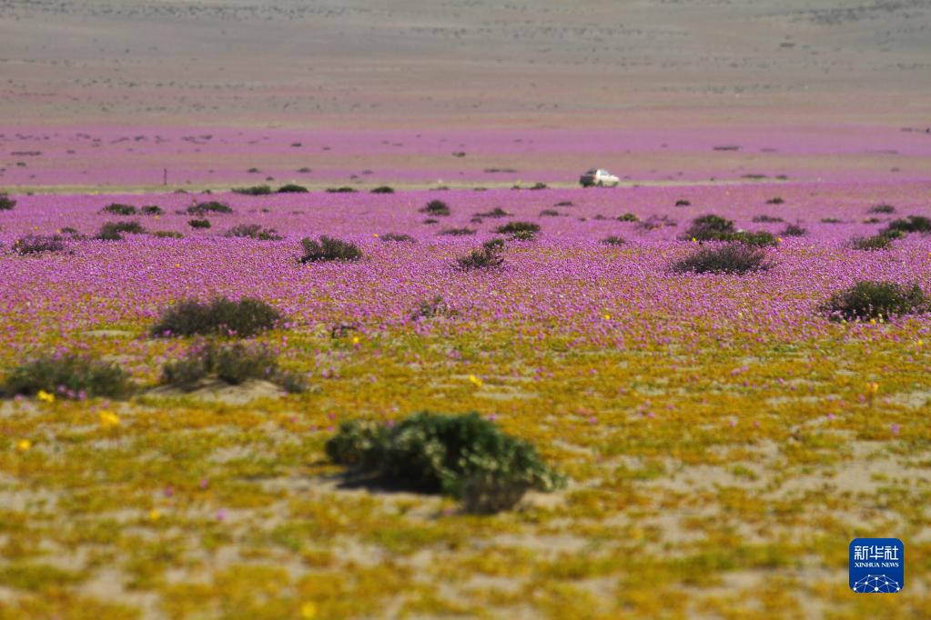 在冬季降水量較多的年份,開春之后,阿塔卡馬沙漠最南部靠近海岸的地方會有很多沙漠植物發芽、開花。由于今年6月至8月阿塔卡馬沙漠南緣經歷了幾場降水,春季到來時,這里便綻放出大片的花毯?!伴_花的沙漠”這一現象作為智利北部春季偶有出現的美景,吸引了各地的旅游者,也為當地科學家研究耐旱植物特性、利用基因技術發展耐旱作物提供了“天然實驗室”。