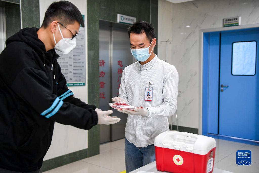 在廣西醫科大學第一附屬醫院,工作人員將采集好的造血干細胞裝箱,隨后將乘坐飛機將其轉運至受捐者所在的醫院(2021年11月攝)。