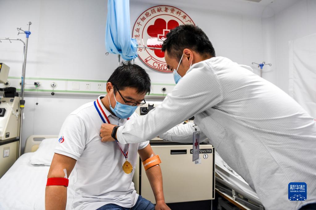 在廣西醫科大學第一附屬醫院,工作人員為造血干細胞捐獻者李醫生(左)戴上獎章(2021年11月攝)。