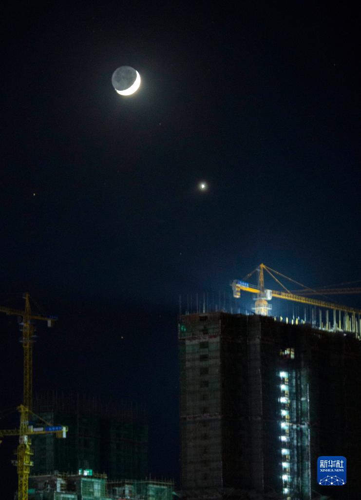 11月8日傍晚在江西省九江市都昌縣拍攝的金星合月景觀,金星和月球在天空相互呼應,格外醒目。