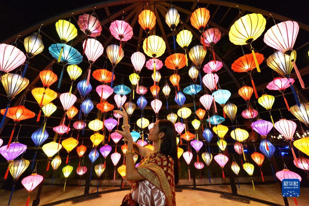 11月8日,游客在泰國北欖府舉行的國際燈籠美食節預展活動上觀賞燈籠。
