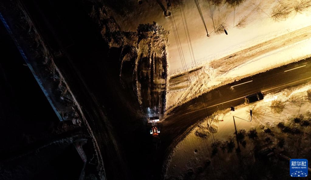 11月11日晚,在通遼市城區,作業車輛連夜清理積雪(無人機照片)。