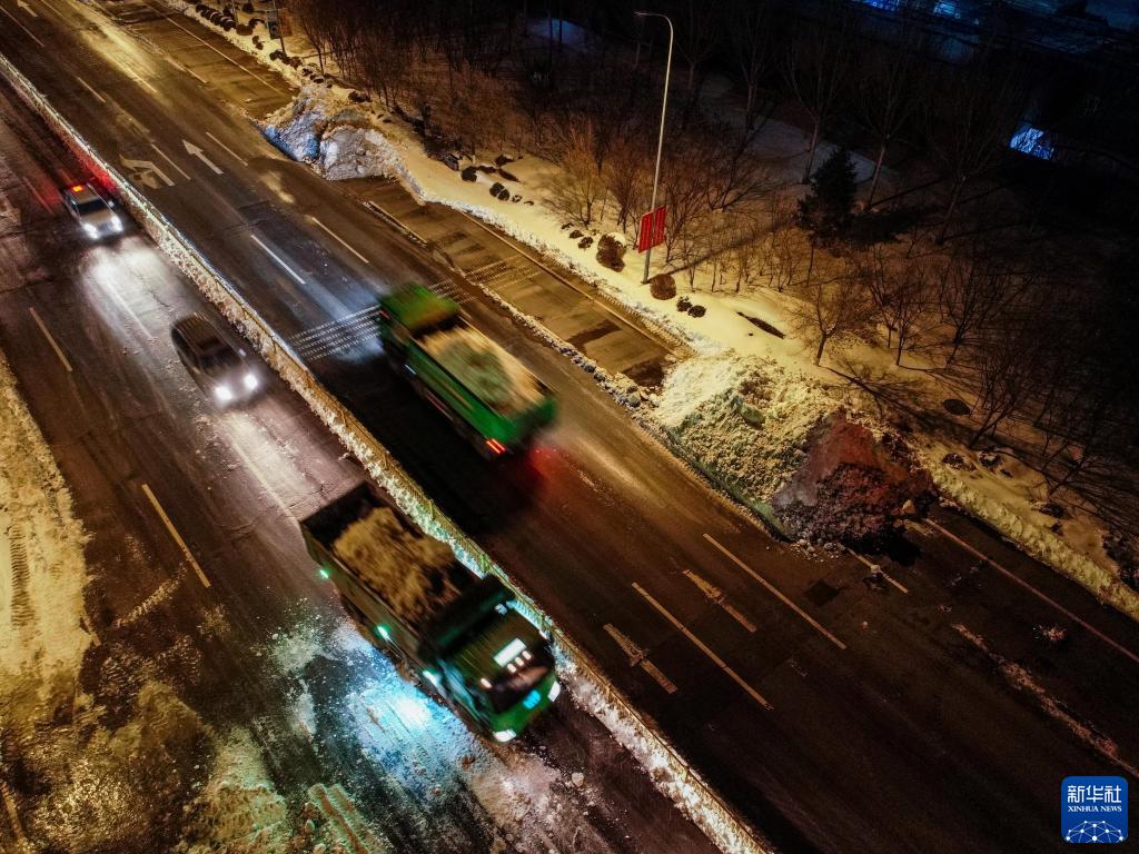 11月11日晚,在通遼市城區,作業車輛連夜清理積雪(無人機照片)。