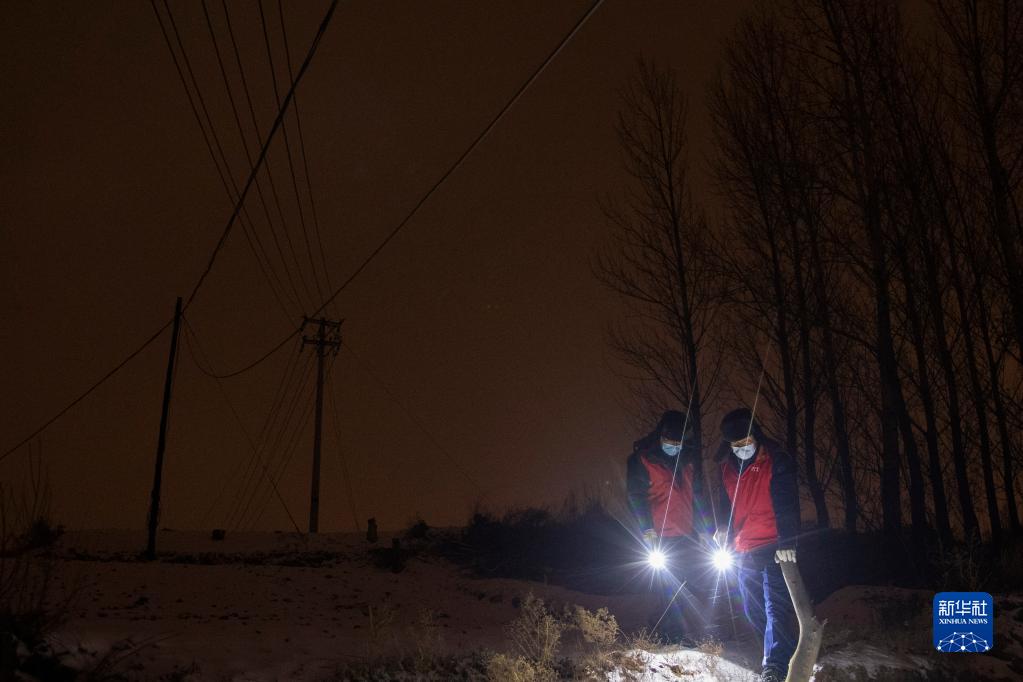 11月21日晚,國網雞西供電公司的工人在雪中巡查線路。