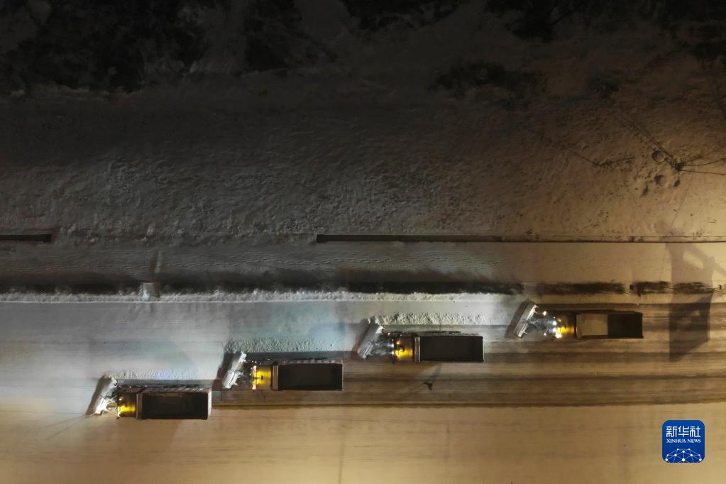 11月21日晚,環衛清雪車在雞西市雞冠區雞東新路上進行清雪作業(無人機照片)。