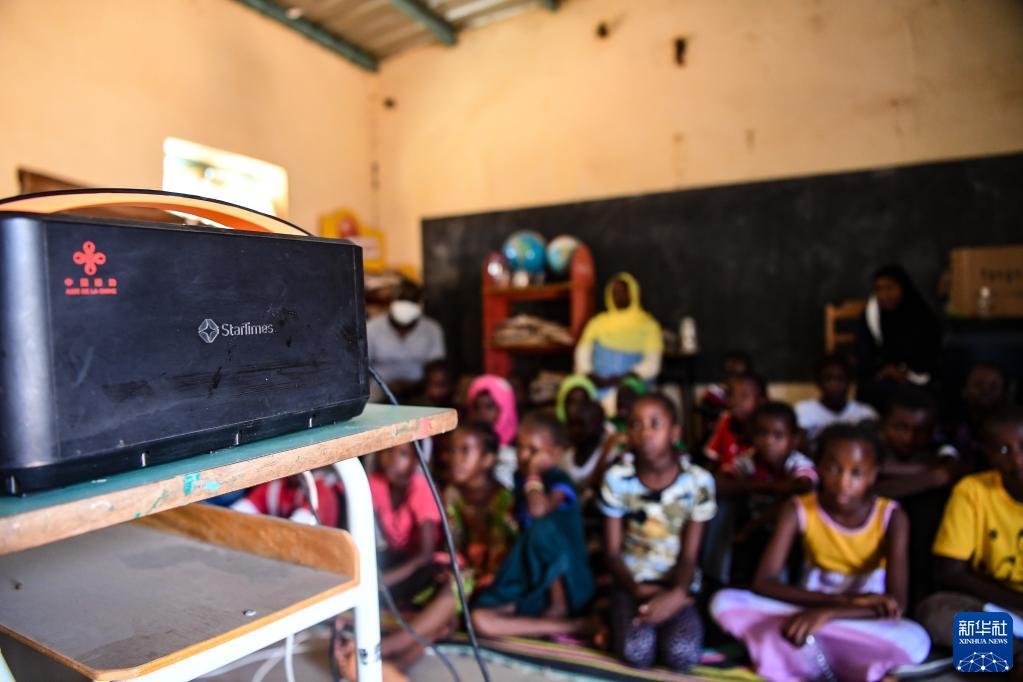 11月22日,在塞內加爾達喀爾近郊的辛迪亞小學,同學們課間坐在教室的地毯上觀看投影播放的動畫片。