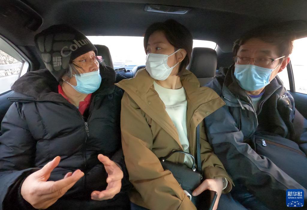 11月24日,剛剛出院的沈建群(左)在回家路上向女兒吳姝(中)講述康復進展。