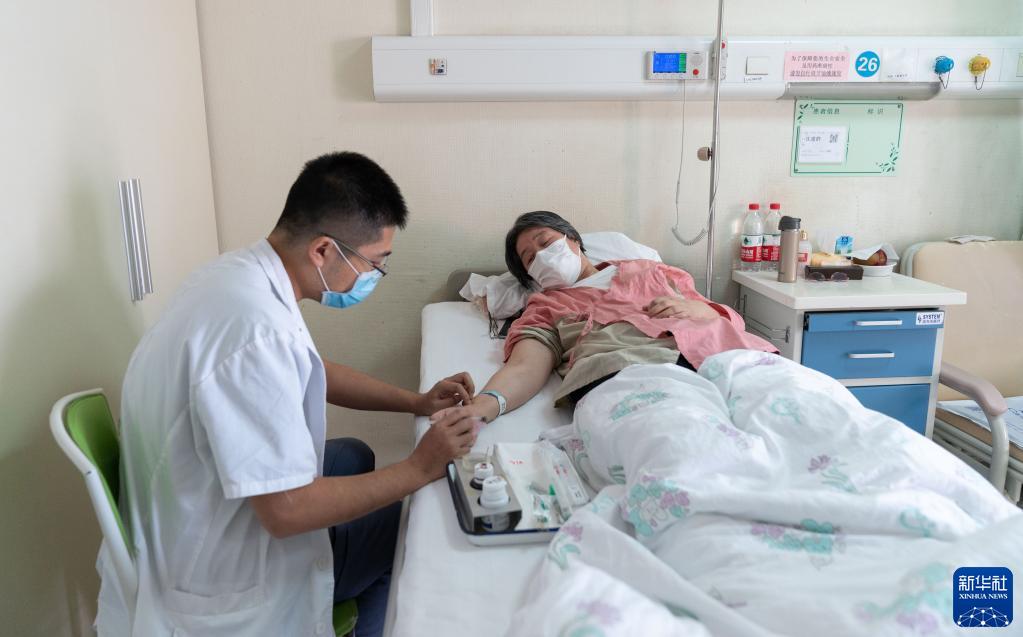 11月11日,在北京大學腫瘤醫院肝膽胰外一科病房,沈建群的主治醫師閆曉巒為她做動脈穿刺,為手術做準備。