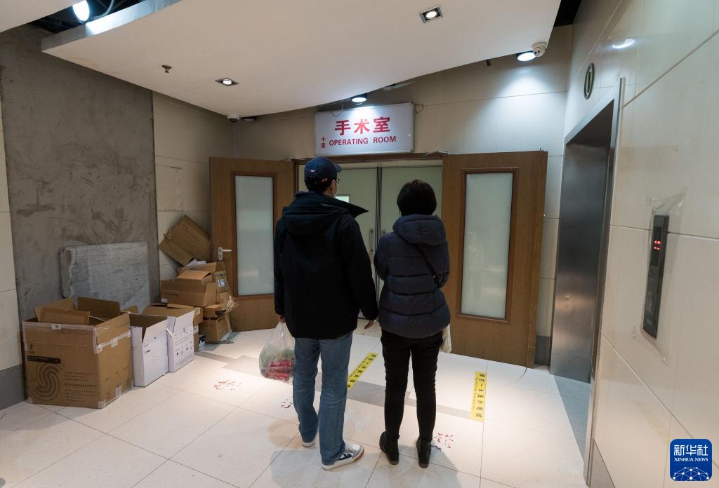 11月15日,在北京大學腫瘤醫院肝膽胰外一科手術室外,沈建群的女兒吳姝(右)與丈夫徐天雄等待手術結束。