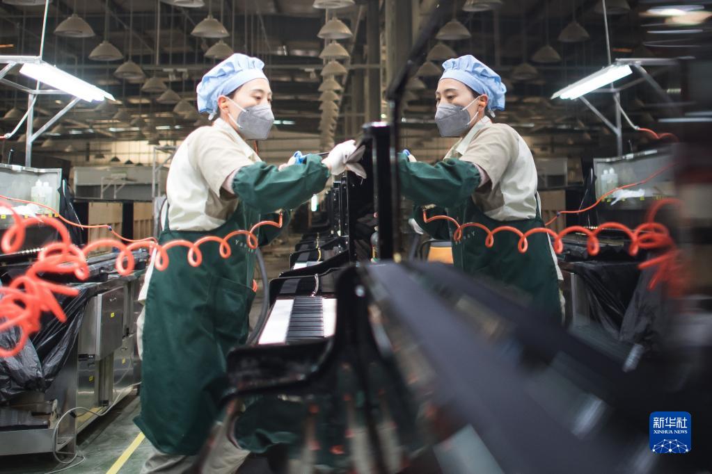 11月23日,工人在柏斯音樂集團宜昌鋼琴生產基地對生產的鋼琴進行擦拭清潔。