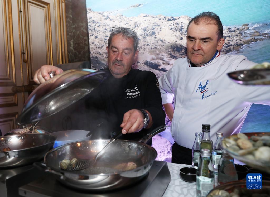 11月29日,在位于巴黎的法國外交部舉行的LA LISTE國際美食榜單揭曉活動現場,一家法國餐廳的大廚現場制作海鮮美食。