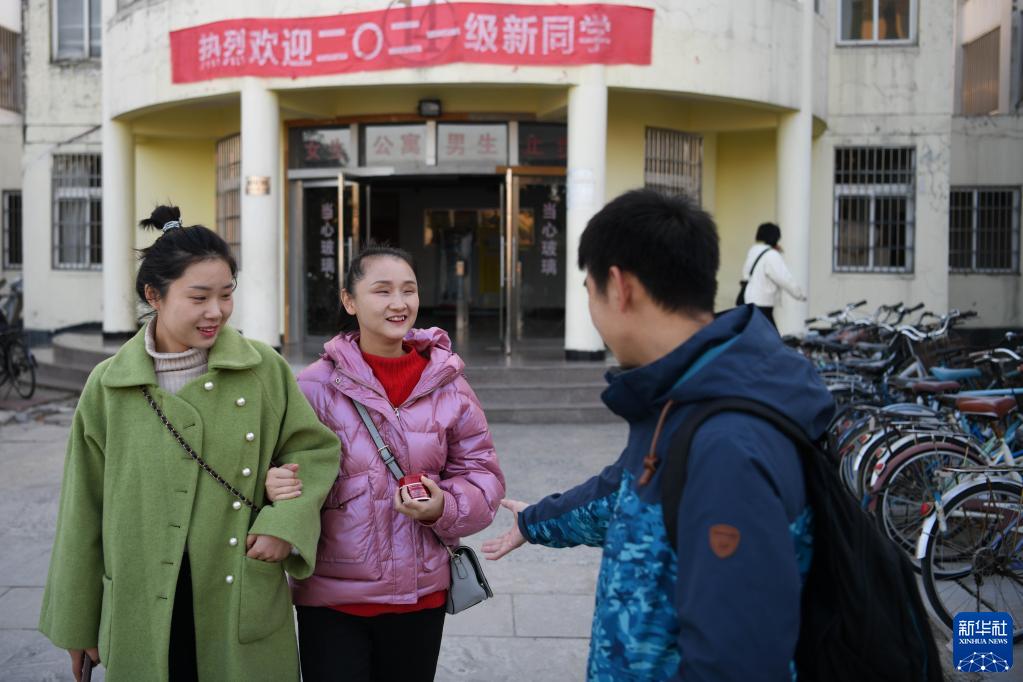 12月2日,在安慶師范大學,唐聞澤(右)在女生公寓門口接張晨(中)去吃早餐。