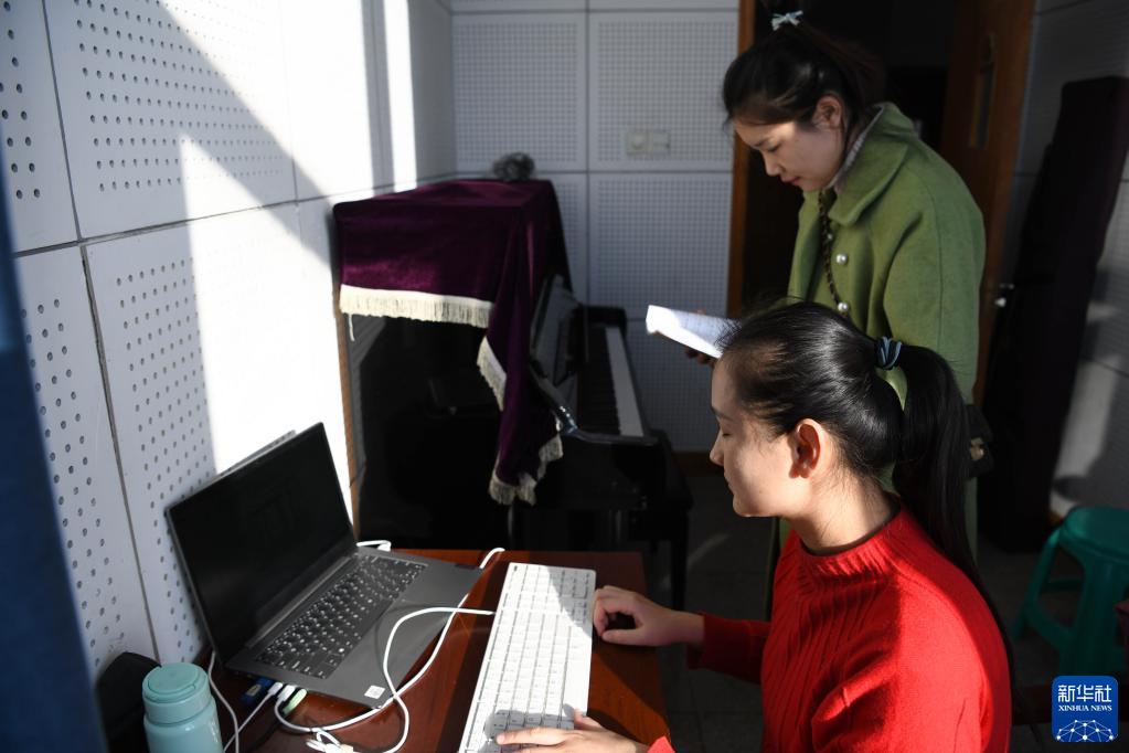 12月2日,在安慶師范大學音樂學院,張晨(前)與同學在琴房內交流。