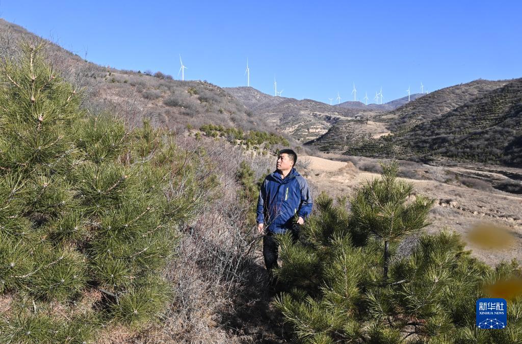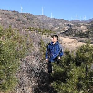 12月3日,在山西省嵐縣附近的山上,鄭二小查看油松生長情況。
