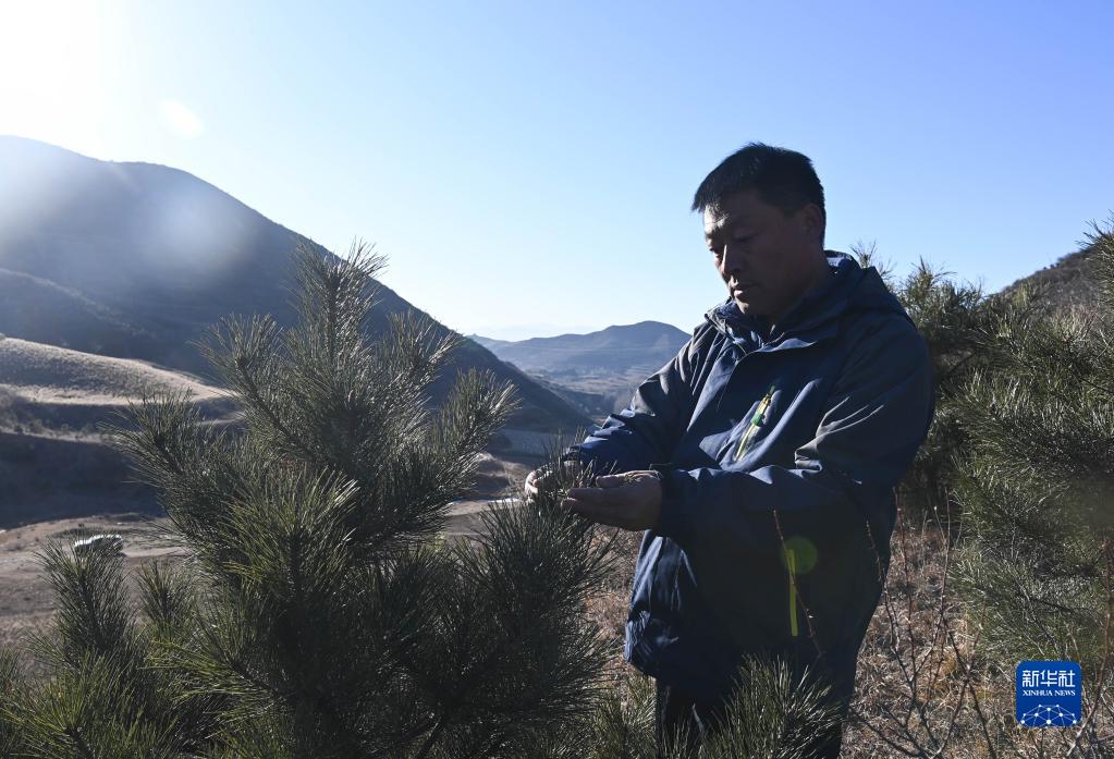 12月3日,在山西省嵐縣附近的山上,鄭二小查看油松生長情況?!⌒氯A社記者 柴婷 攝