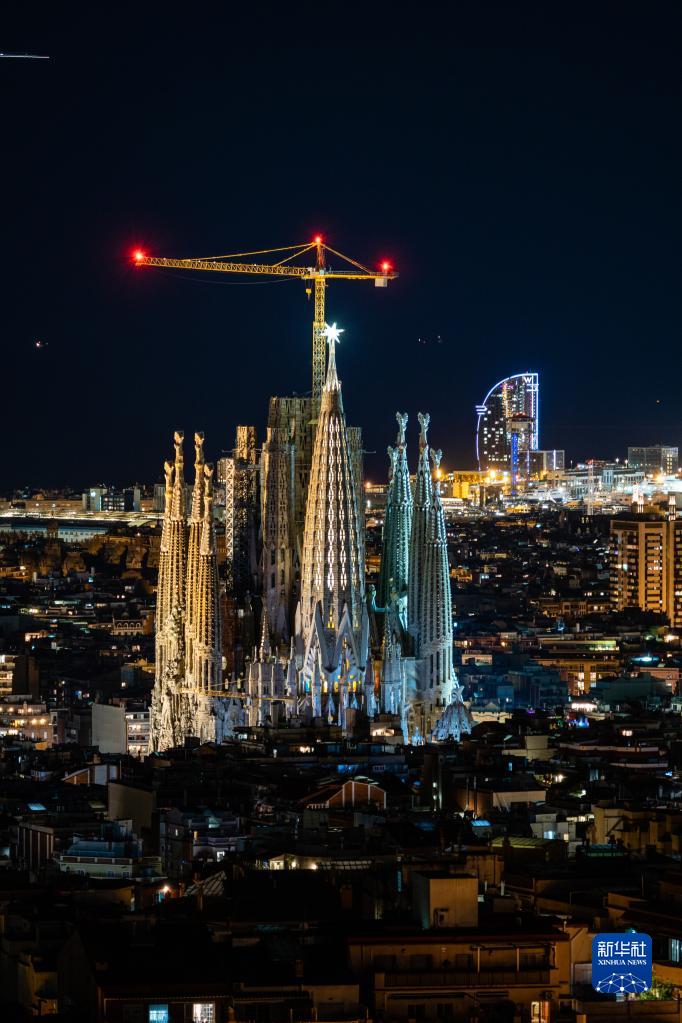 西班牙巴塞羅那地標建筑圣家族大教堂(又稱圣家堂)上的塔頂之星于11月29日安裝,12月8日點亮,標志著教堂建設“封頂”。圣家堂由西班牙著名建筑師高迪設計,從1882年開始修建至今,預計將于2030年竣工。