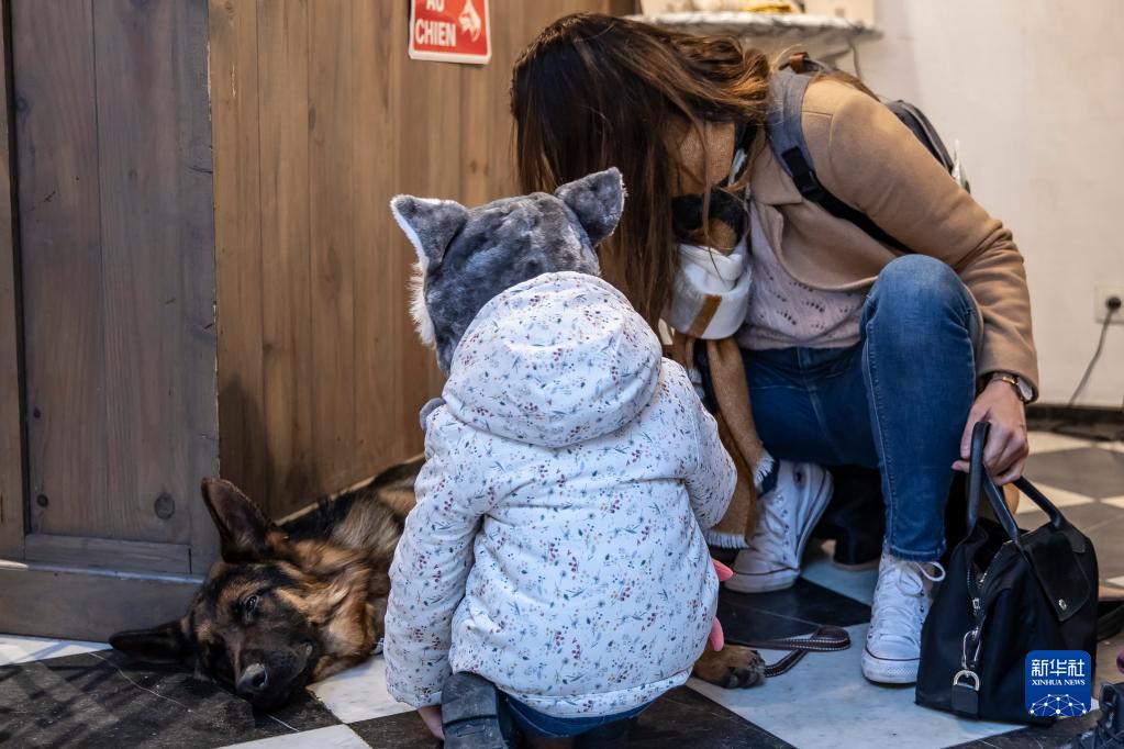 12月22日,在法國北部城市里爾名為Waf Cafe的咖啡館,顧客與狗狗互動。