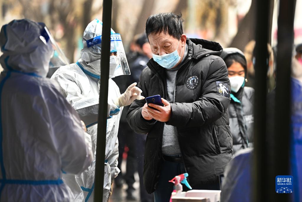 12月25日,防疫人員在西安市新城區皇城西路檢測點指導市民掃碼檢測。