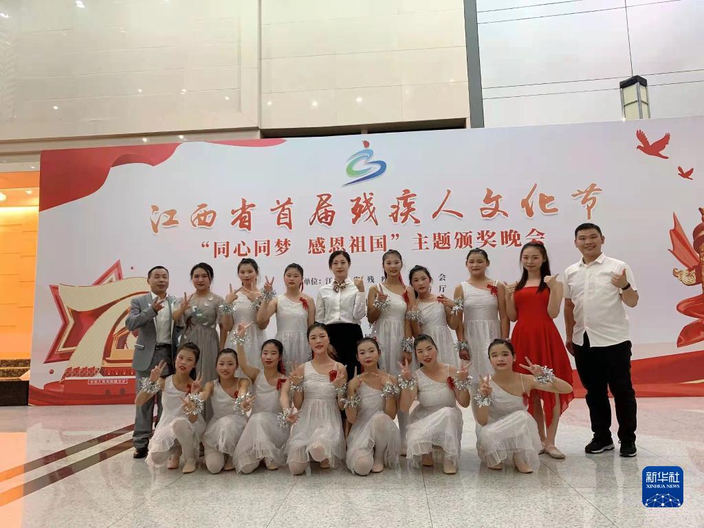 2019年江西省首屆殘疾人文化節演出現場,樊海艷帶著參加舞蹈演出的學生們一起合影(資料照片)。